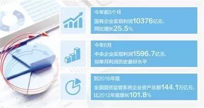 完善顶层设计、全面启动试点、“刀刃向内”健全监管……一系列改革措施,激发着国企的活力和竞争力。在国民经济增速放缓的背景下,今年前5个月,国有企业实现利润10376亿元,同比增长25.5%,中央企业今年6月实现利润1596.7亿元,创单月利润历史最好水平。到2016年底,全国国资监管系统企业资产总额144.1万亿元,比2012年底增长101.8%,增加值贡献占全国GDP的1/7。